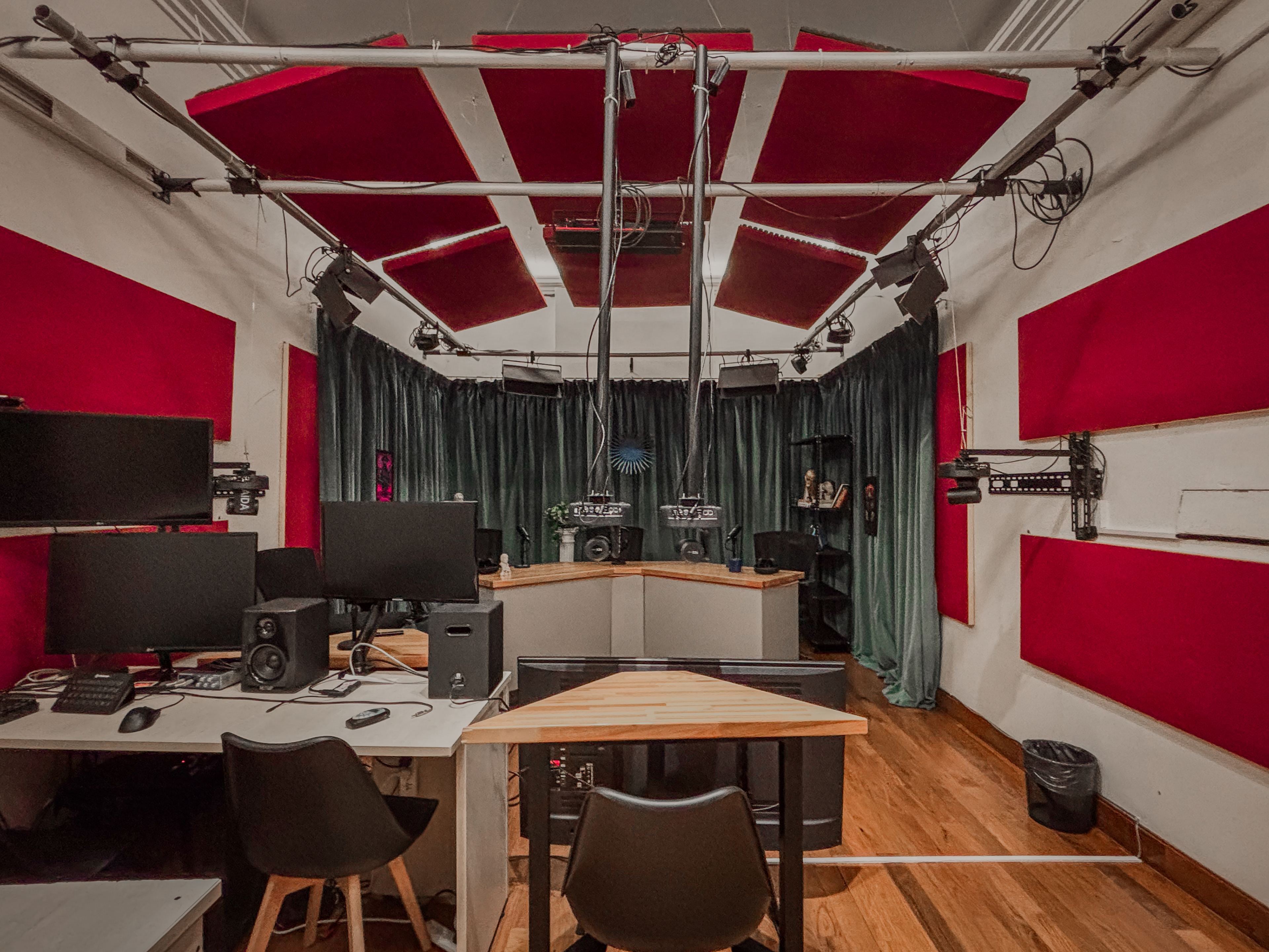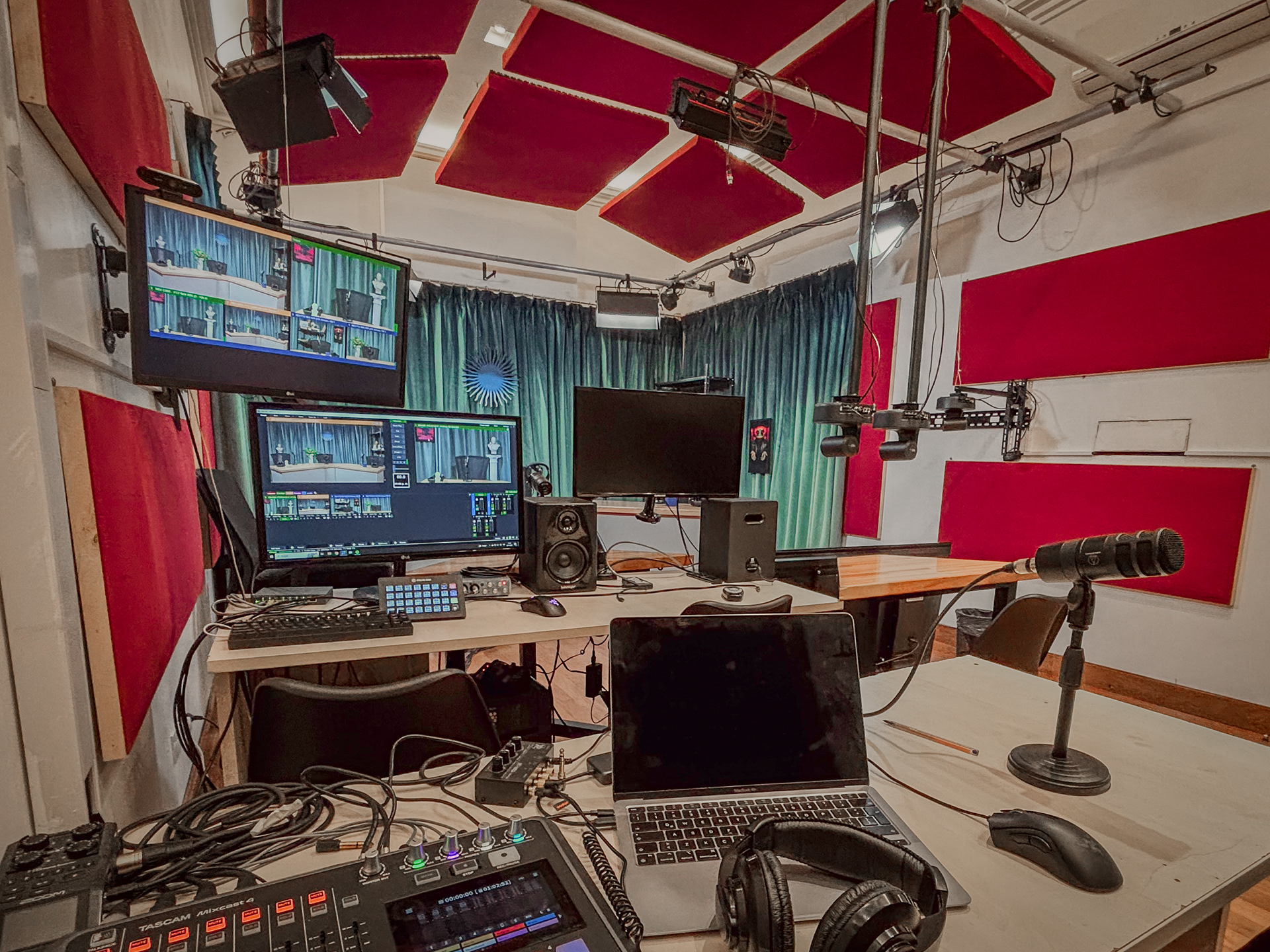 El estudio cuenta con equipamiento de audio, video e iluminación profesional. Además de estar acustizado para generar un espacio ideal para la grabación.